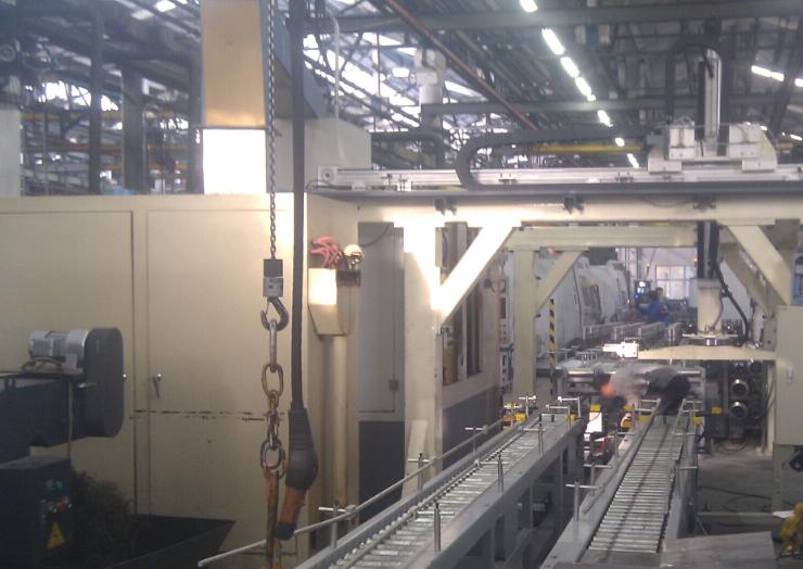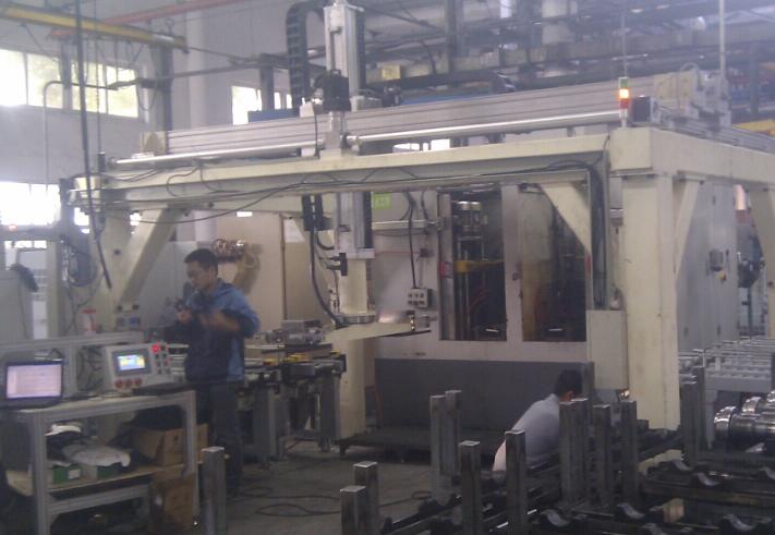 步骤b:上料传送带轴管到位信号,机械手根据程序抓取轴管,2个手爪都抓取带淬火料,准备放入淬火机